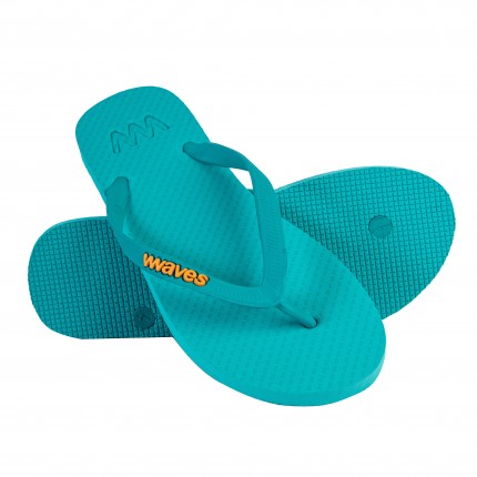 Fun and bright, these aqua flip flops are the perfect summertime accessory. The flip flops are built to last with durable thong straps and cushiony natural rubber soles that mold to your feet for extra support and comfort. Perfect for by the pool or the lake, these rubber flip flops feature slip-resistant bottoms for added grip while walking on wet ground. Every pair of Waves flip flops is handcrafted from eco-friendly, recyclable rubber so you can feel good about your purchase.