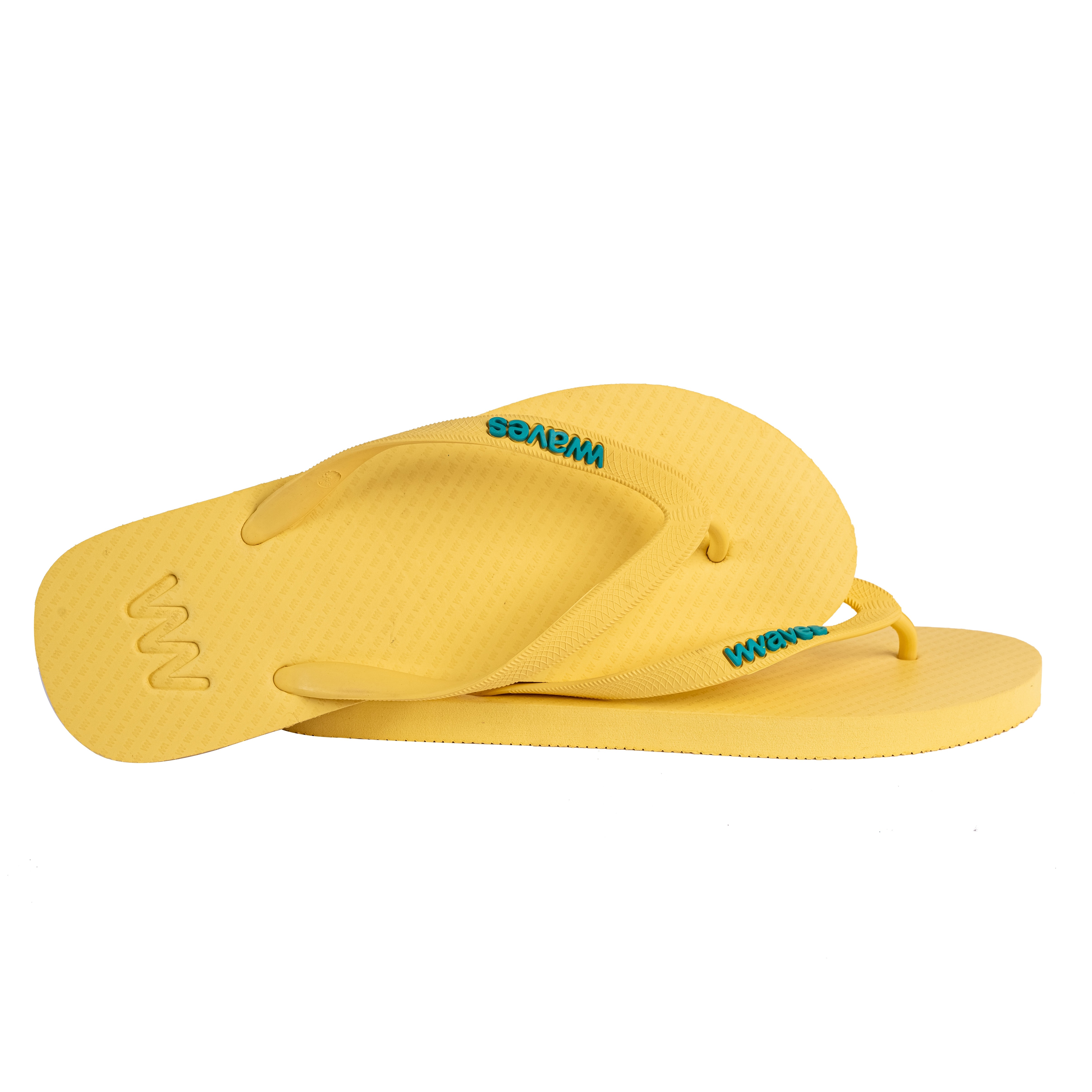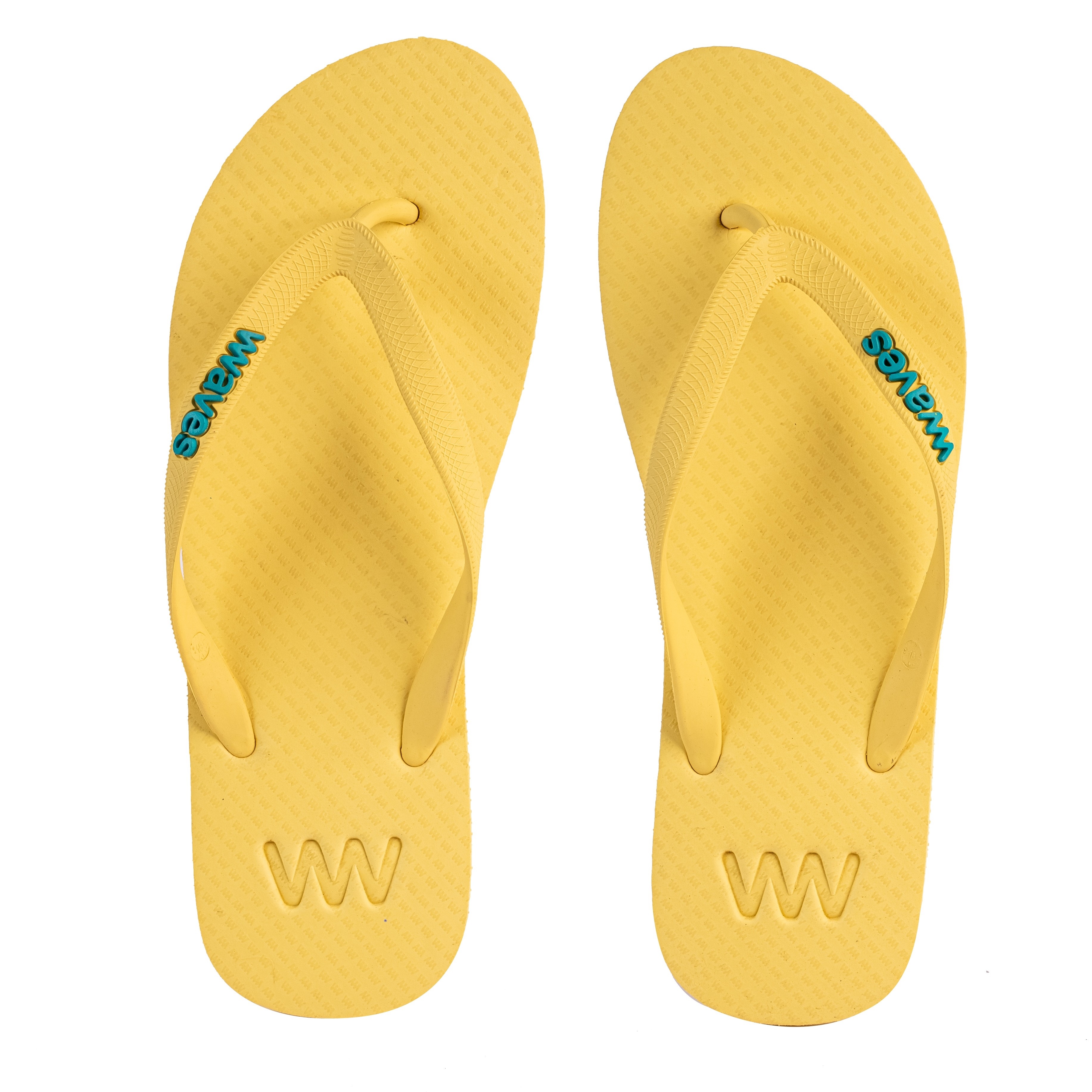 Dress your feet for summer in these vibrant lemon yellow unisex flip flops. Perfect for the beach, by the lake or at the pool, our rubber flip flops are made with durable thong straps and slip-resistant bottoms for added stability when walking on wet ground. These supportive flip flops also feature a natural rubber base that molds to your feet for extra cushiony support. Every pair of Waves flip flops is handcrafted from eco-friendly, recyclable rubber so you can feel good about your purchase.